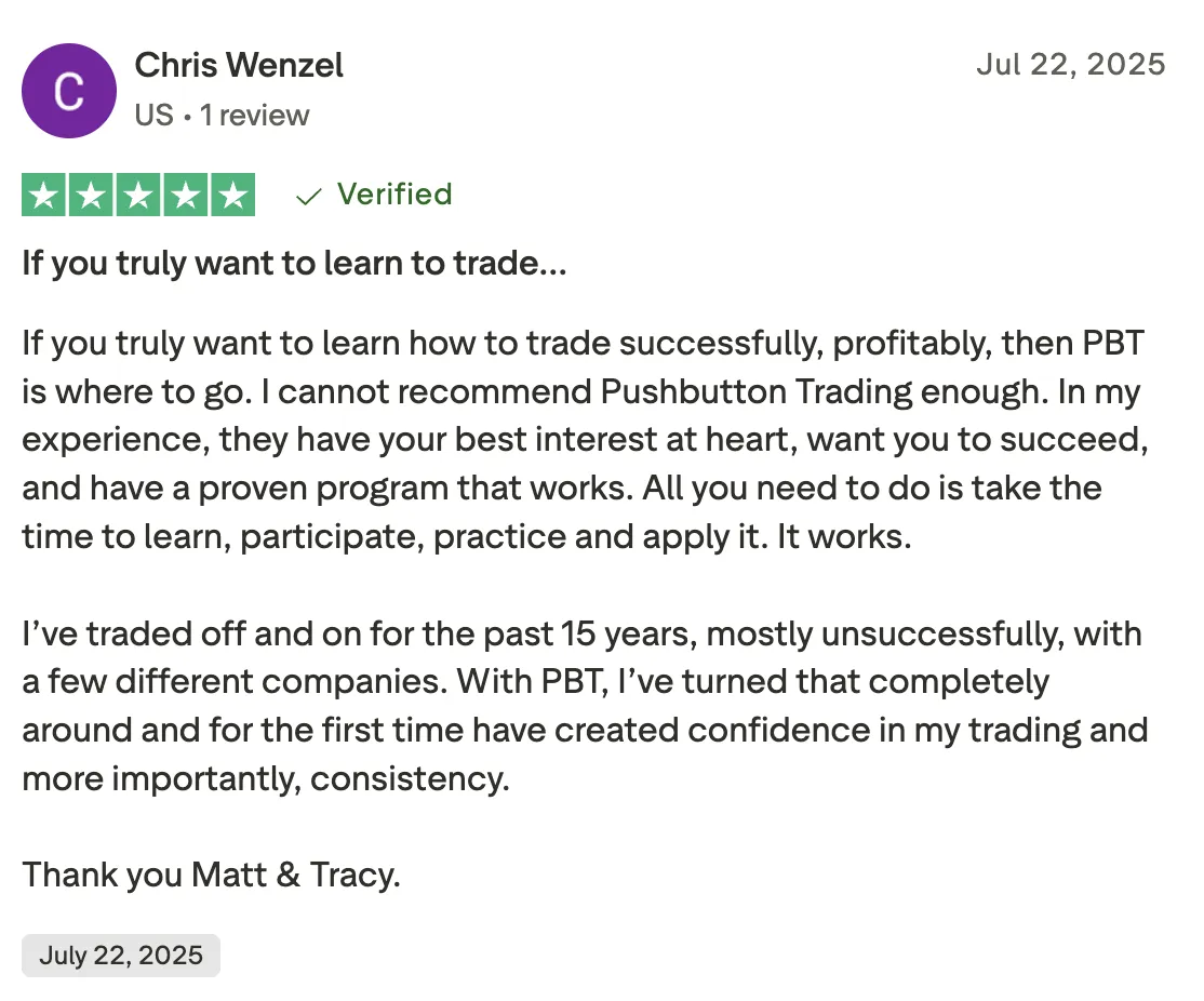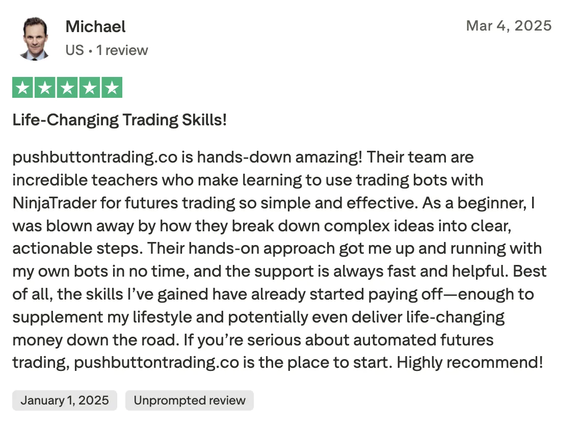 The Push Button Trading mentorships, courses, classes, live events, and content are provided for educational purposes only. We are not providing financial advice. It is your responsibility to test all strategies and plans. You are the only one pushing the buttons and it is your responsibility to fully understand the risks before implementing any of the education provided by Push Button Trading.