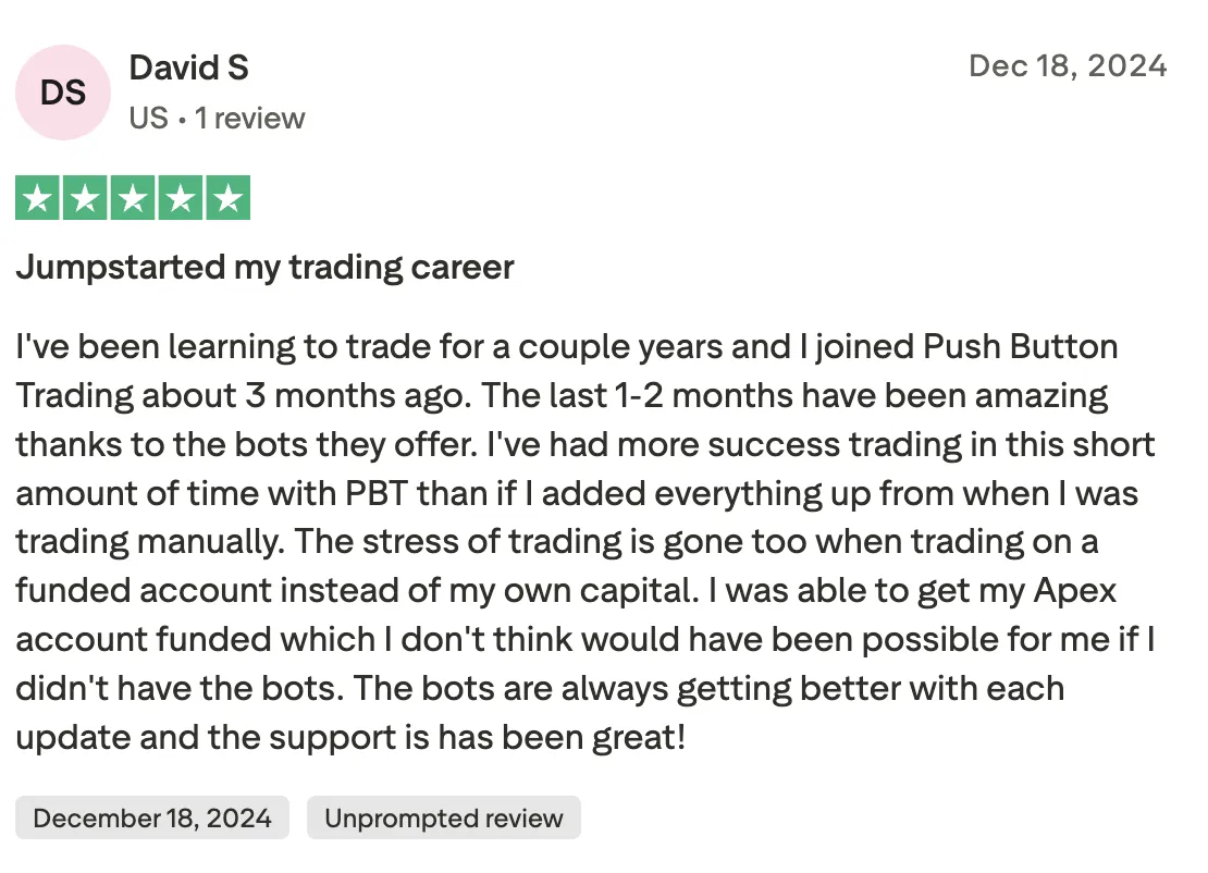Push Button Trading bridges the gap between complex algorithmic trading and everyday traders. Our mission is simple: make professional-grade automated trading accessible to beginner traders.
