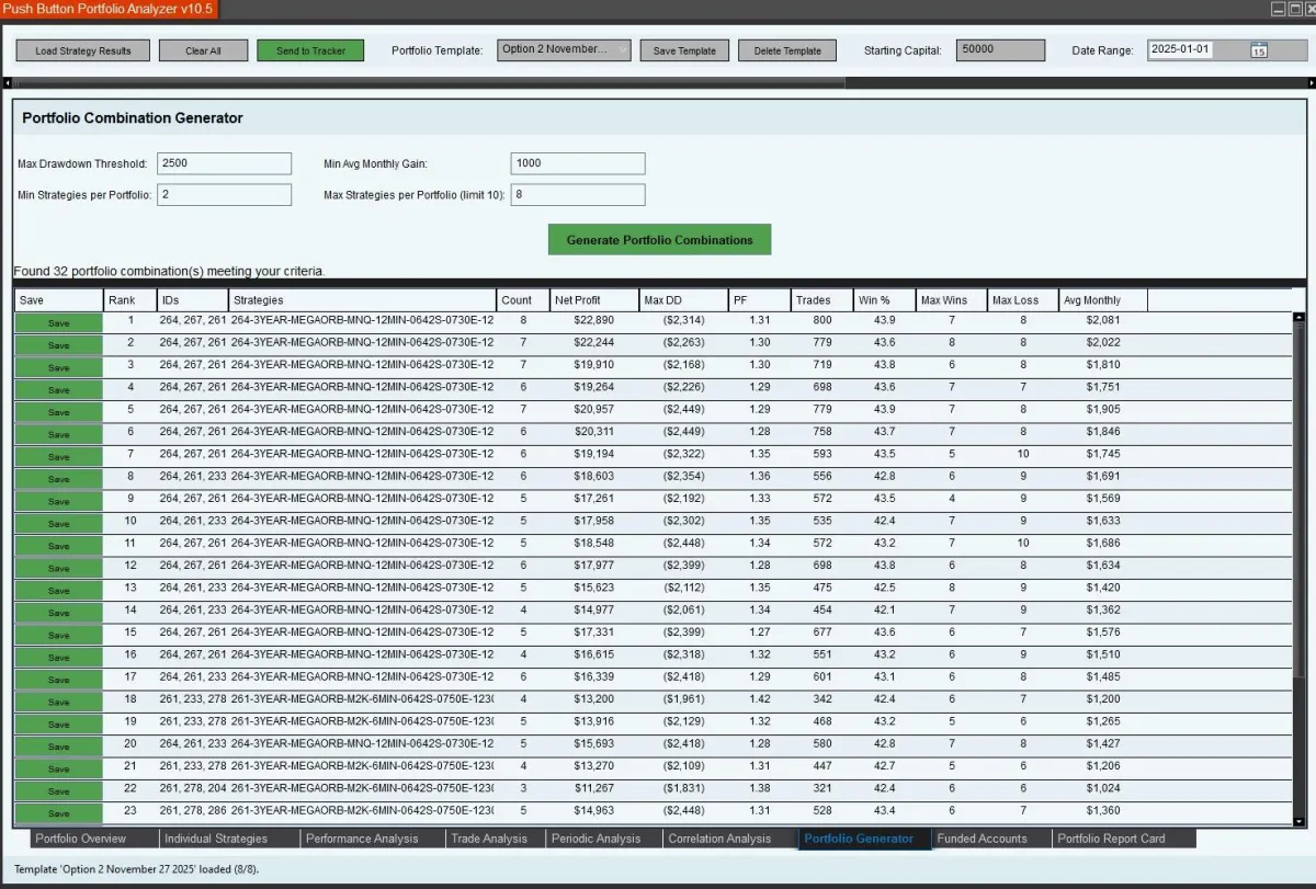 Use Portfolio Generator to find every combination that hits your targets. Filter by drawdown, profit, and more.