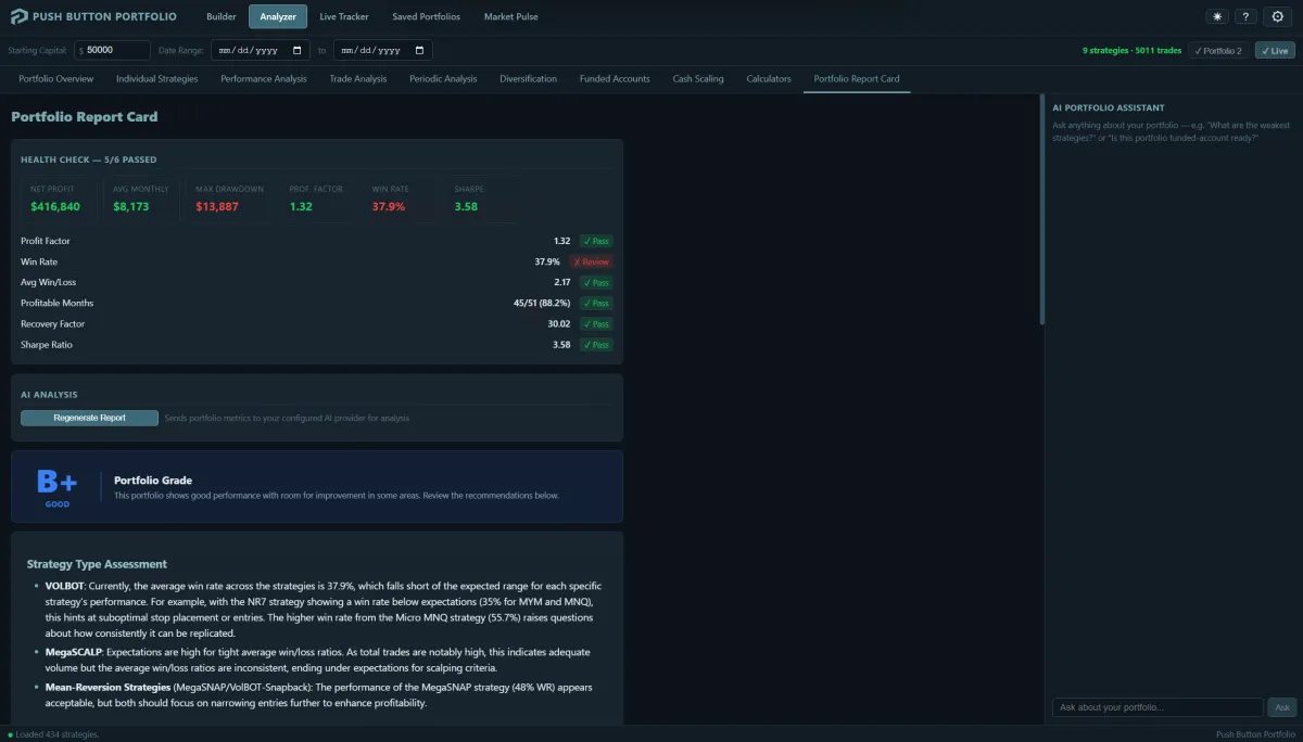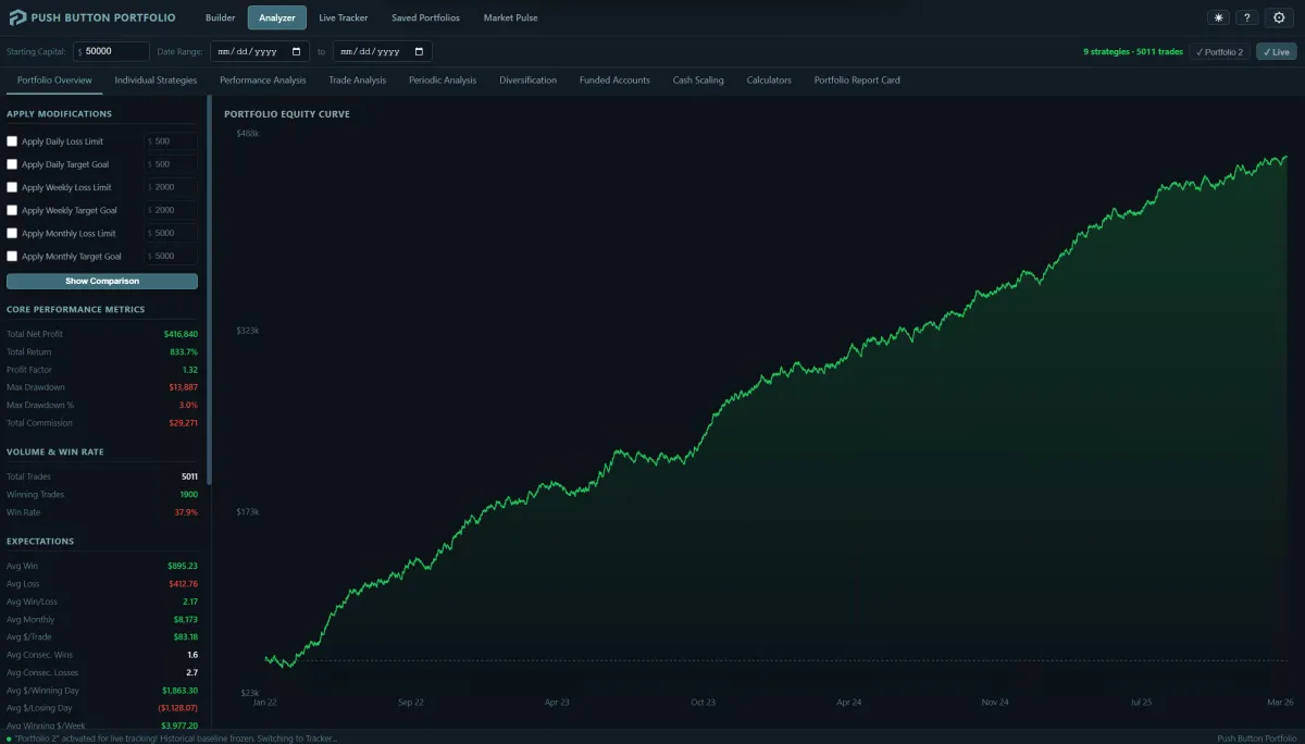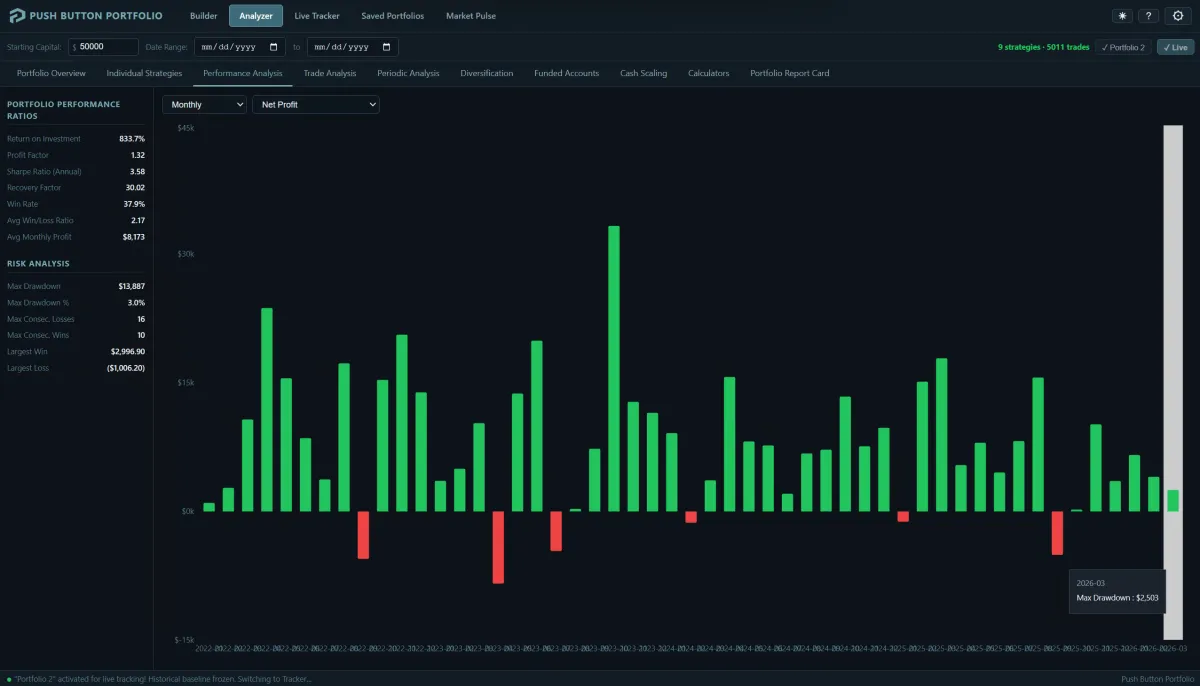 The Analyzer stress-tests your portfolio against historical data before you go live. The Portfolio Tracker monitors your live performance after deployment — comparing real results against historical benchmarks so you know if something is off.