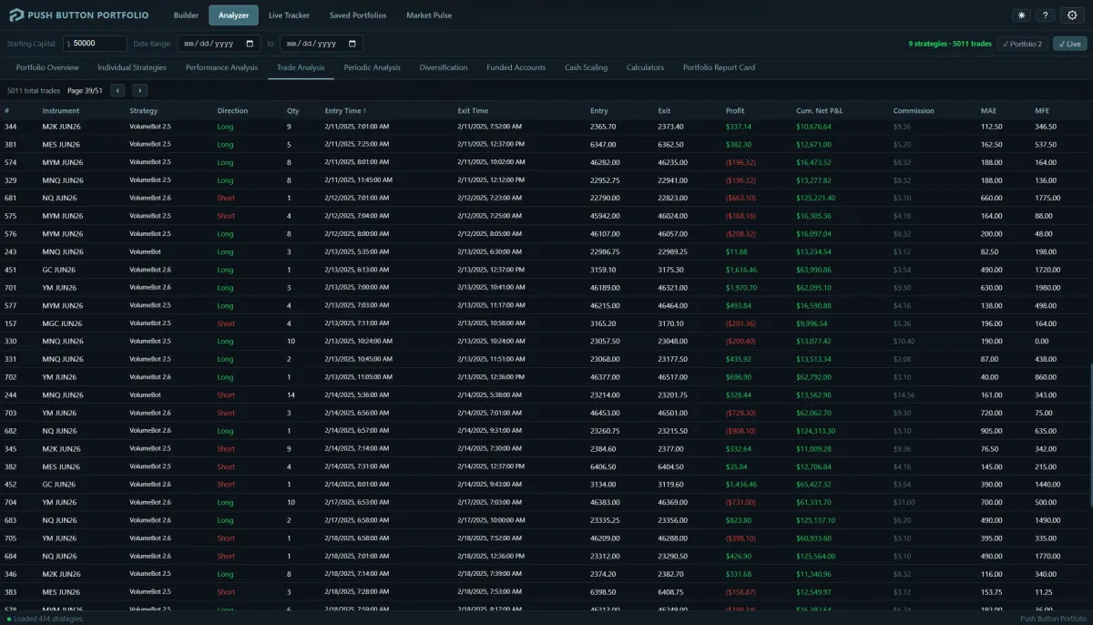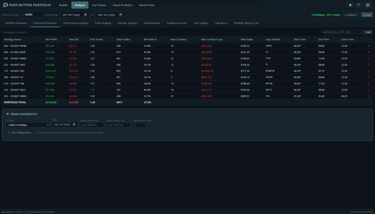It depends on your prop firm's rules and your risk tolerance. The Analyzer shows you exactly what your pass rate would have been historically, so you can compare different portfolio configurations and pick the one that fits your goals.