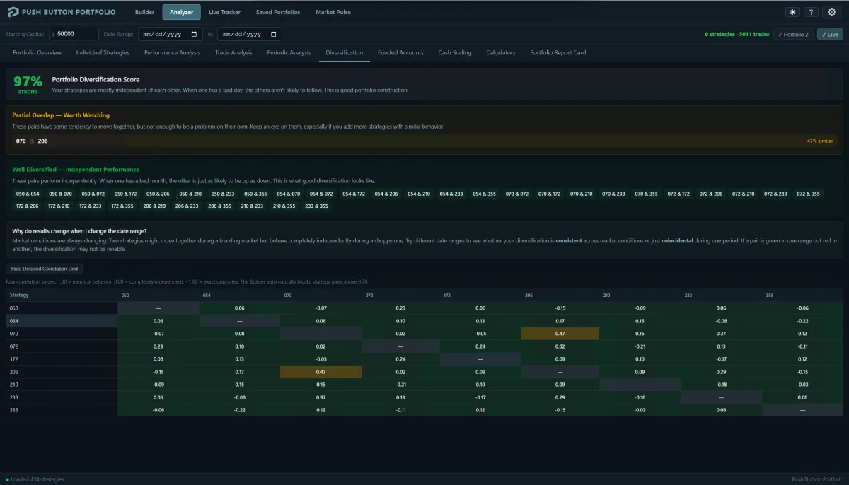 Shows how strategies interact and where they overlap, helping traders spot hidden correlation and build low-risk, funded-account-friendly portfolios.