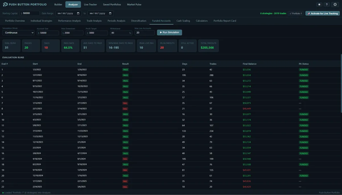 Model how your portfolio would perform under real eval rules — including pass rate, time to pass, and long-term payout potential — before paying for an evaluation.