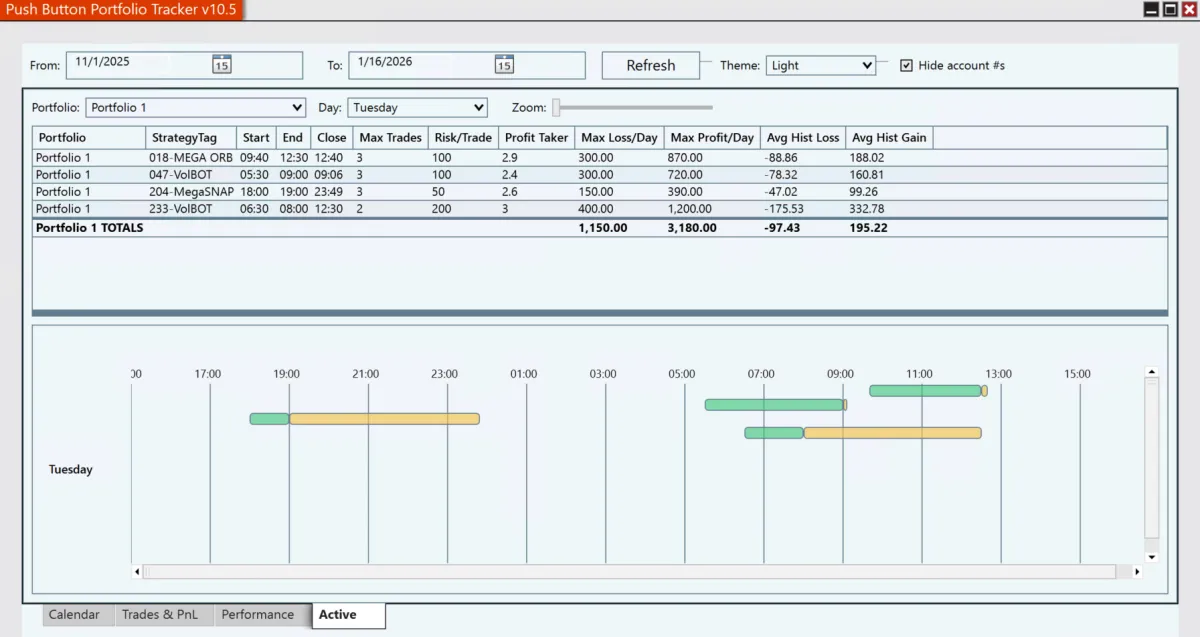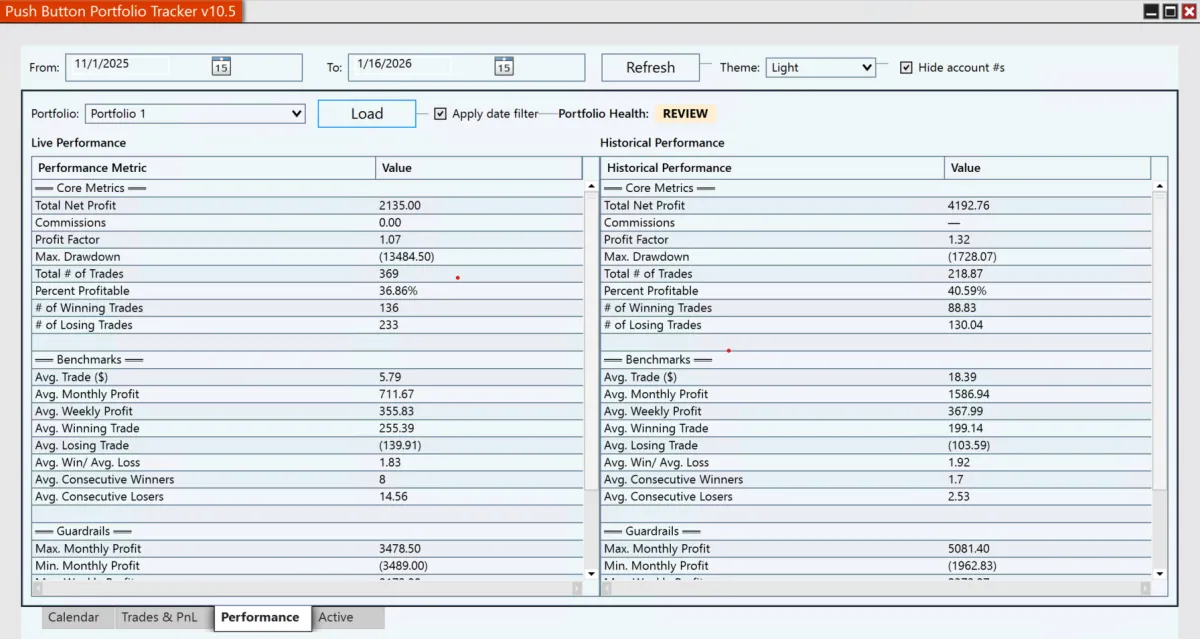 Track results, compare to historical averages, and know how you are doing, and when to review. Monitor live performance without emotion.