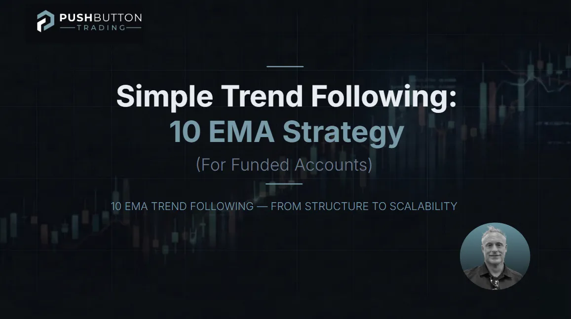 Learn how to use the 10 EMA trend following strategy to capture sustained directional moves on your funded futures account. Push Button Trading walks you through setup, risk management, and prop firm compliance on NinjaTrader. Whether you're trading manually or running our pre-built 10 EMA bot, this guide gives you everything you need to trade consistently and keep your funded account protected.